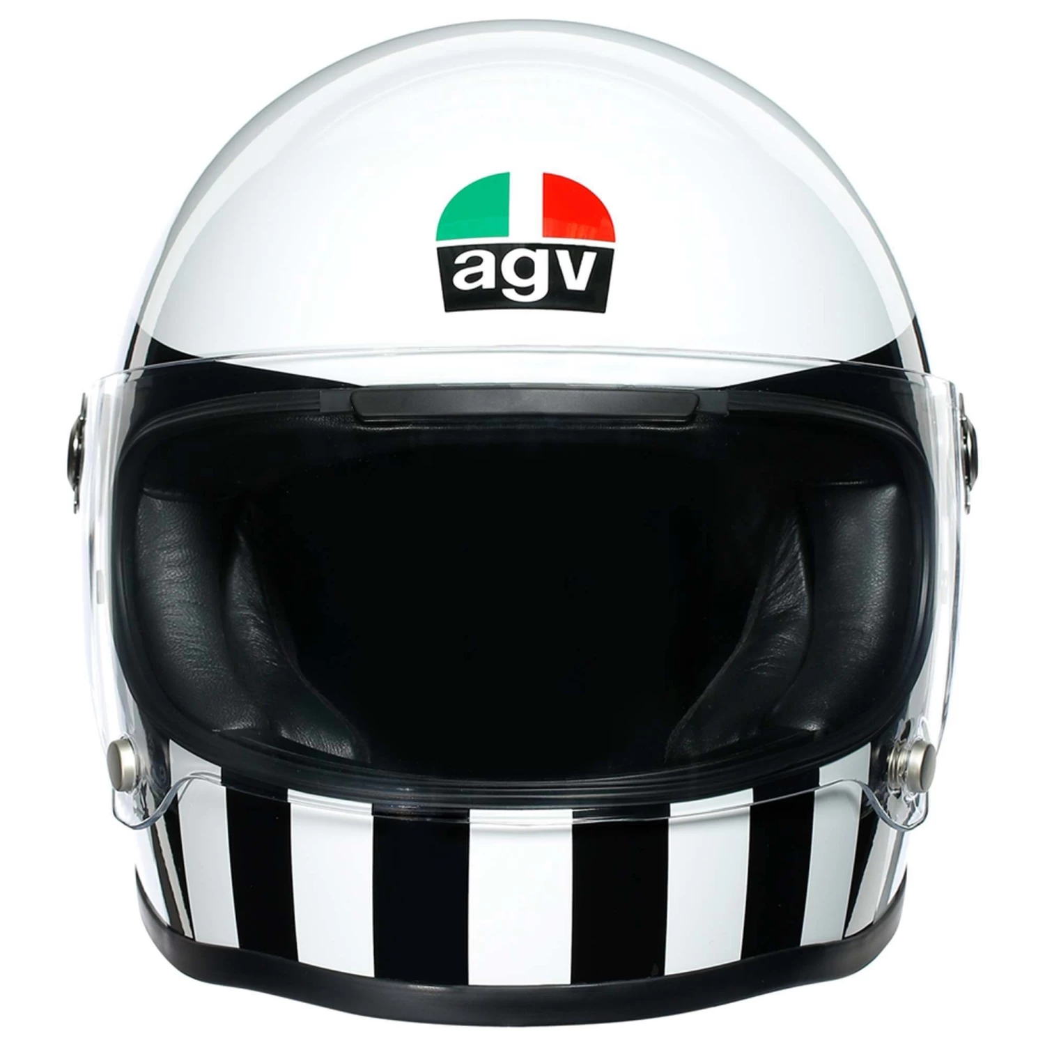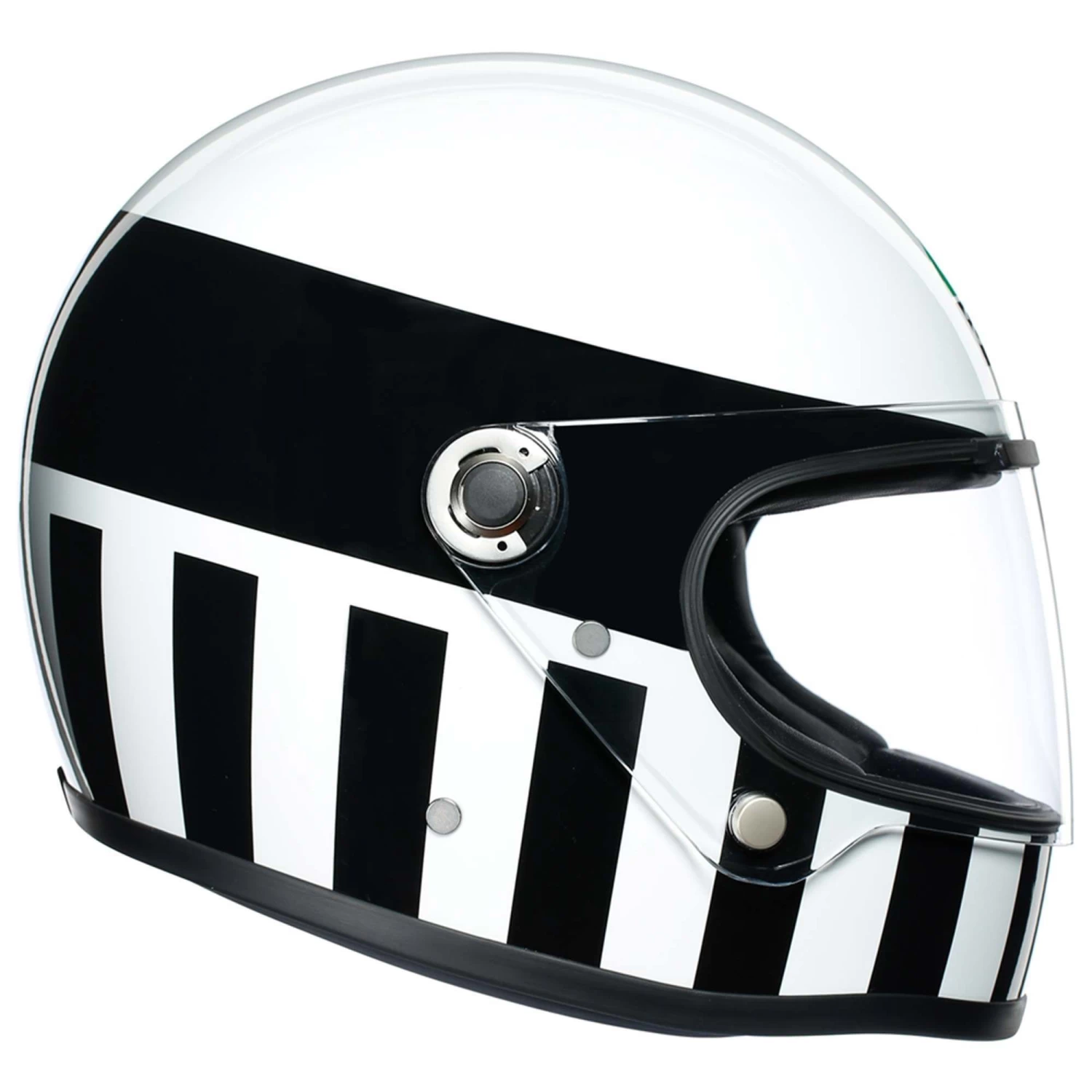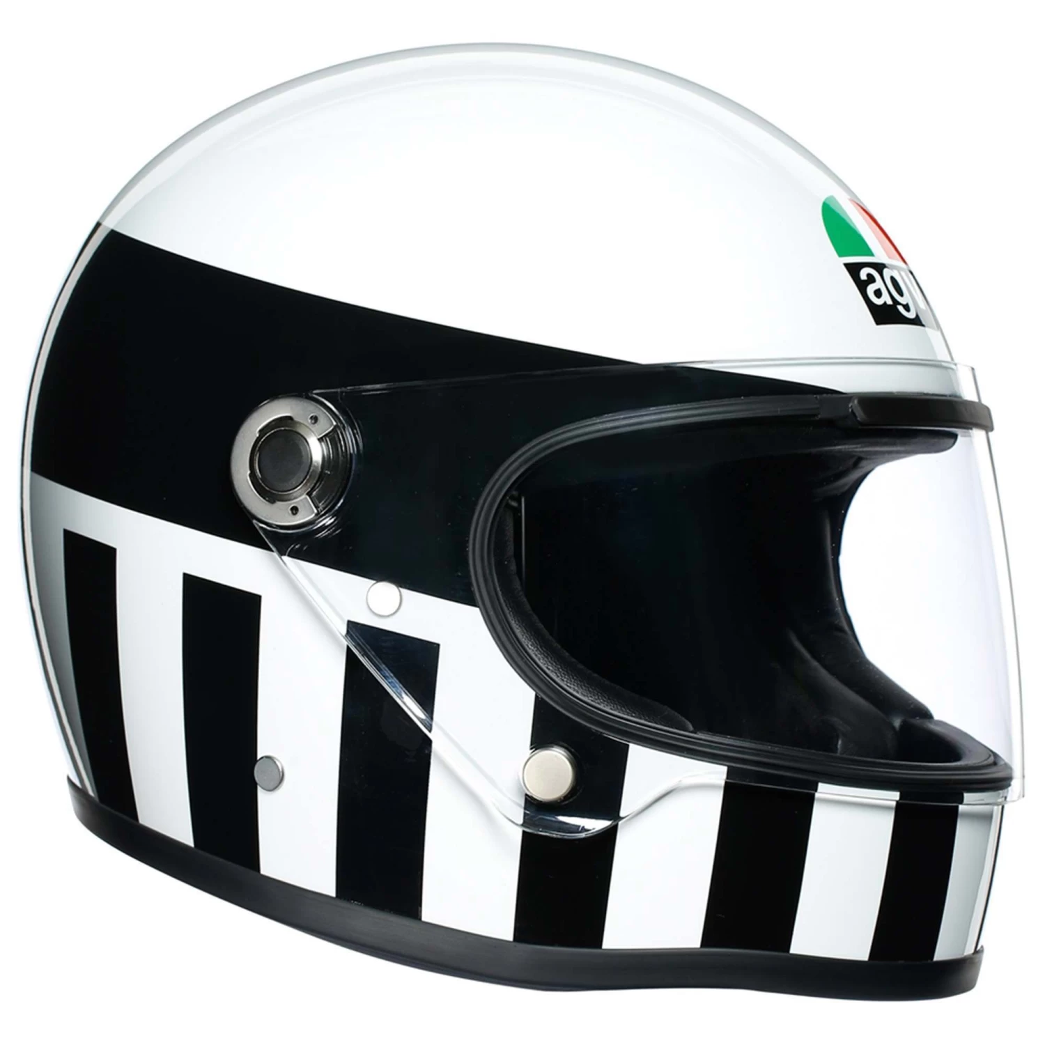 Half a century later, AGV introduces the X3000. An impressive replica of Ago’s helmet with a pedigree that, quite frankly, few other “retro-inspired” lids could ever live up to. AGV have worked really hard to recreate all the details of the achingly beautiful original while applying all of the safety features you’d expect to find in a newly released helmet. They used a strong, resilient composite-fibreglass shell which makes for a compact, light-weight helmet with a slim outer profile. The helmet is available in three different shell sizes, spread across six head sizes.