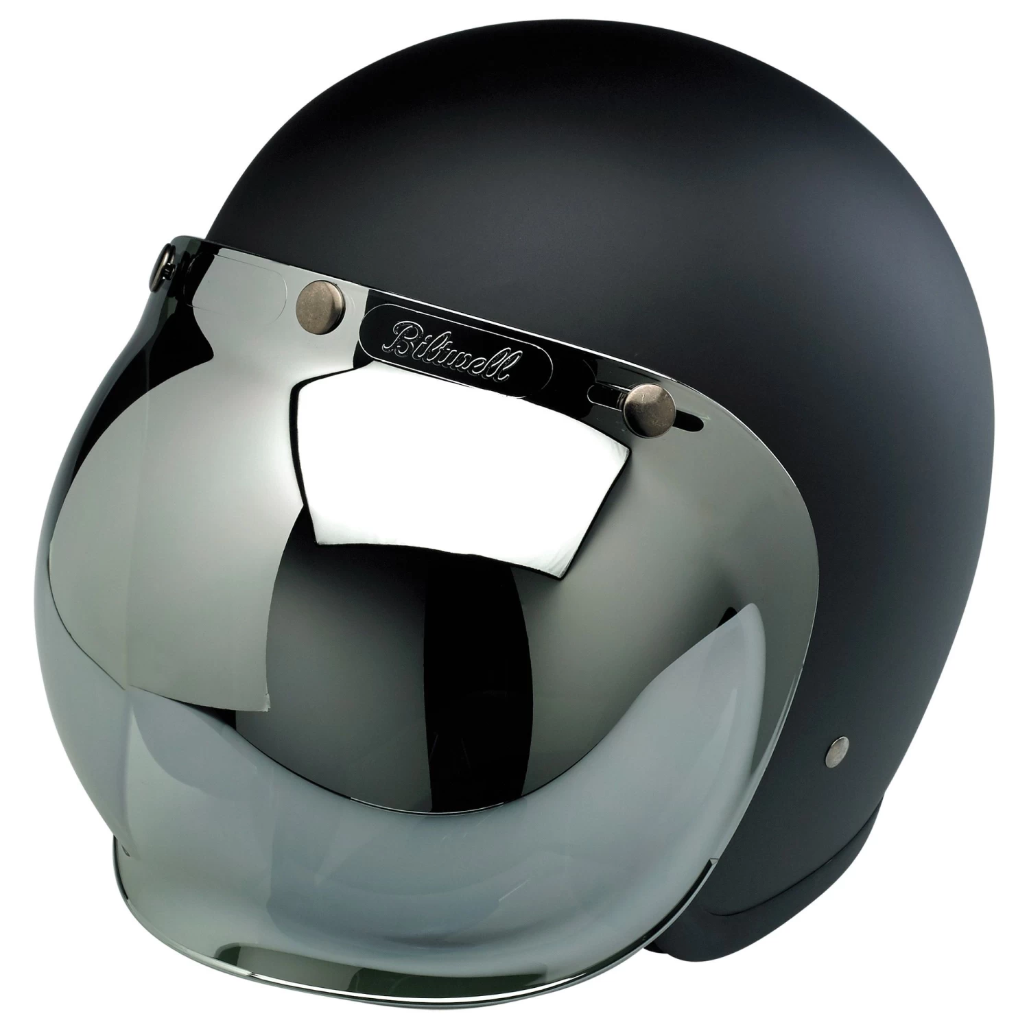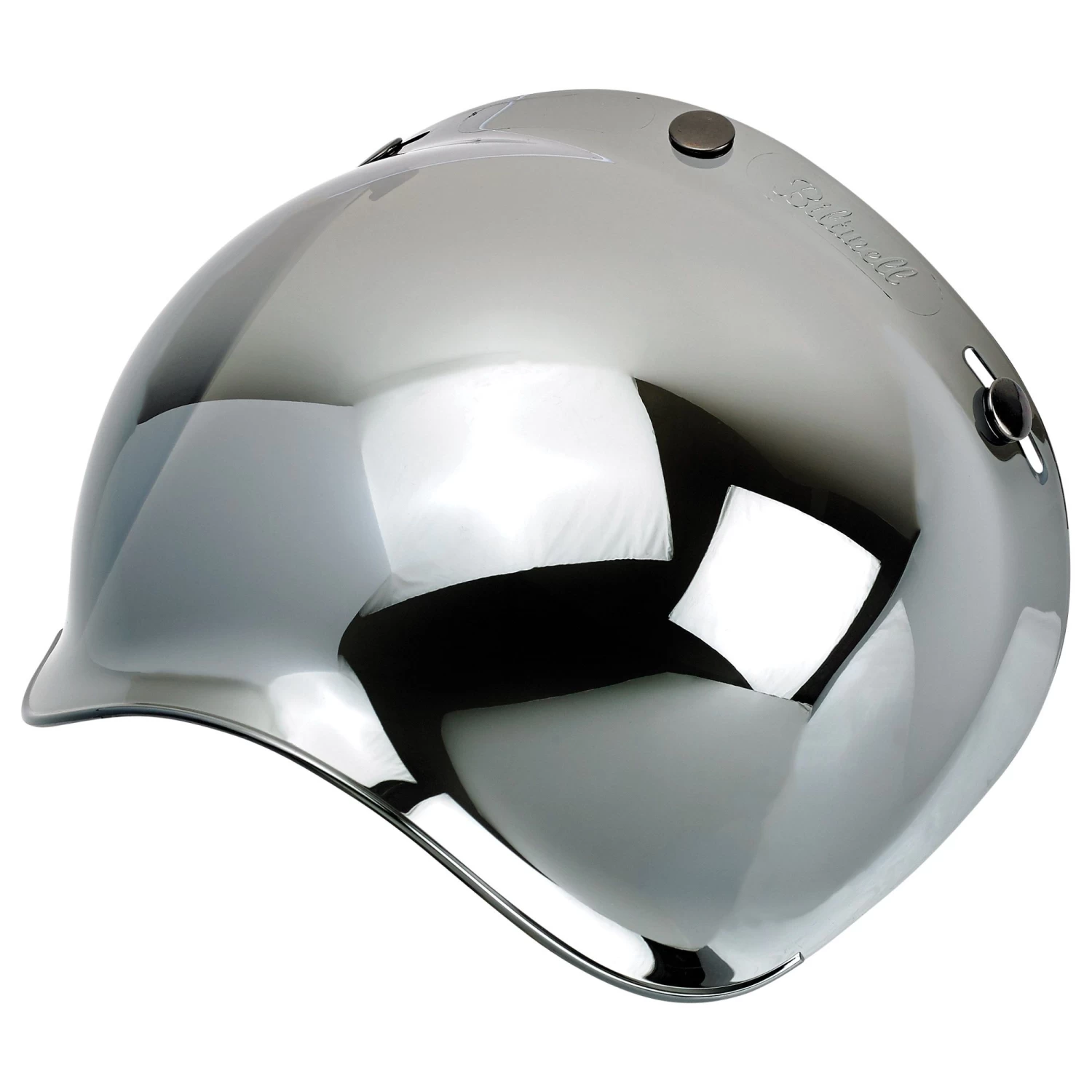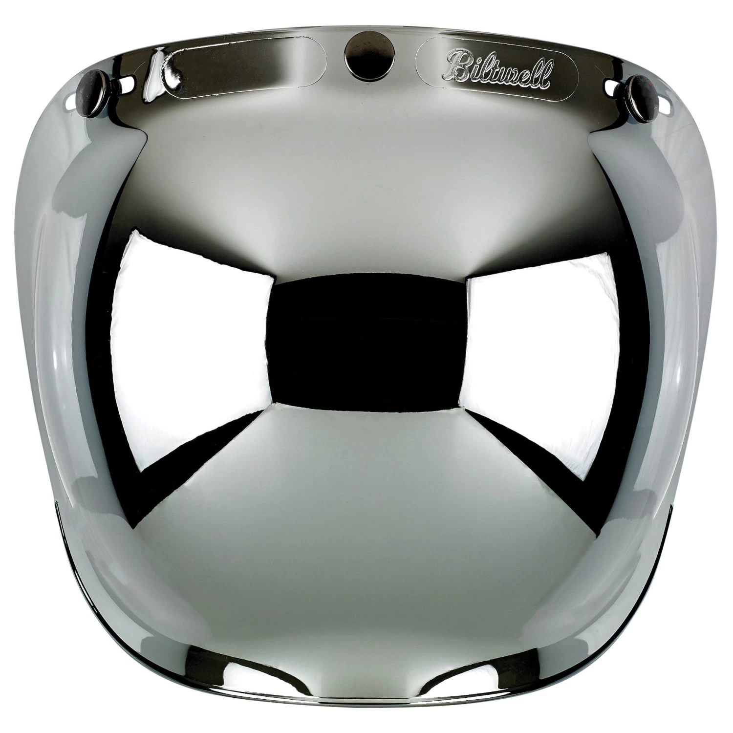 Anti-Fog injection-molded polycarbonate shields in solid, clear and mirror gradient finishes. Plated snaps feature the Biltwell anvil logo. Fits stock 3-snap visor configuration on most three snap helmets. UV +50 rated. Accept no substitutes: make sure the next bubble shield you own features the “Biltwell” script logo.