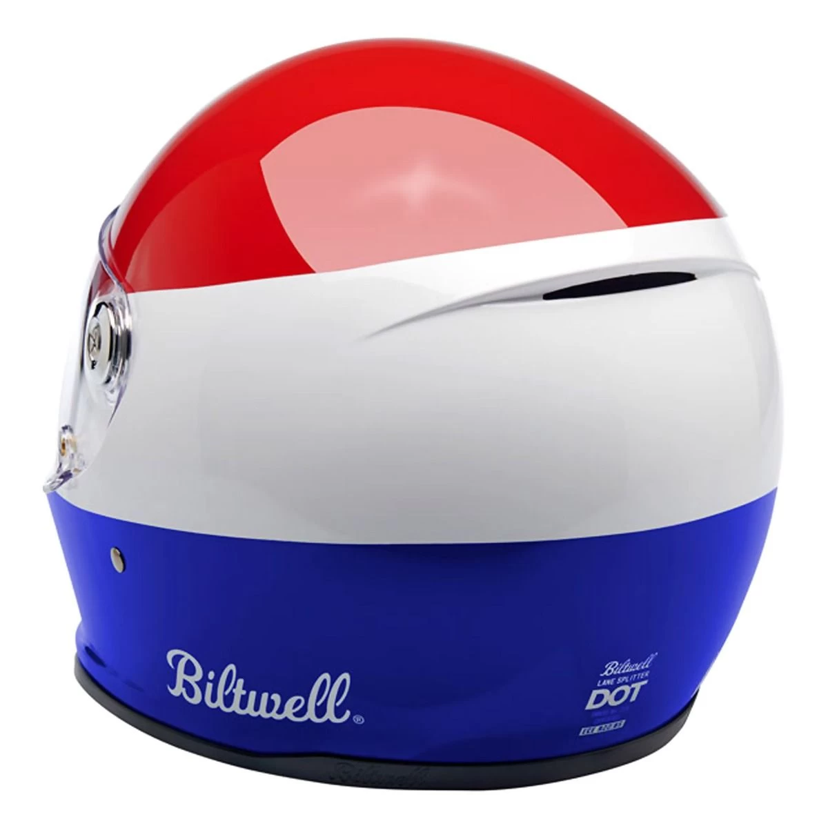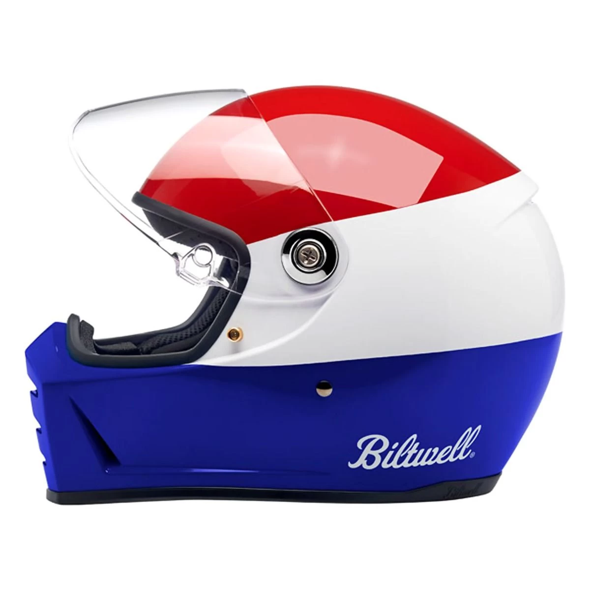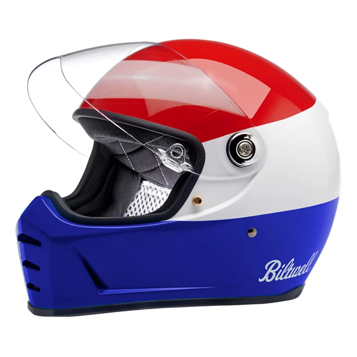 After the best-selling Gringo and Gringo S helmets, Biltwell brings us the Lane Splitter. This highly anticipated drag racing style helmet is crafted around Biltwell’s proprietary ABS shell and features a shock-absorbing EPS liner with gorgeous hand-stitched interior padding. Just like the Gringo and Gringo S, the interior liner with its removable cheek pads and BioFoam chin bar cushion makes for an extremely comfortable helmet that you can wear all day without experiencing any fatigue or discomfort. The aggressive looking lines of this helmet truly set it apart in the retro-styled helmet market. The front chin bar vents are a prominent feature and in combination with a venturi vent on the rear provide ample air-flow. The injection-molded face shield operates on simple hinge mechanics and the brass peg and hole lock mechanism is utterly utilitarian yet aesthetically pleasing in its simplicity. Opening and closing the visor becomes a breeze. Not literally though: the visor secures firmly in place to prevent any wind or rain leaking inside. A bold and brutish looking helmet at a very attractive price point, we’re big fans!
