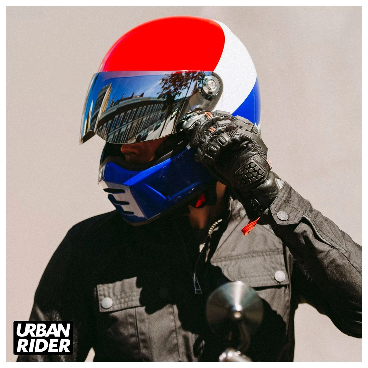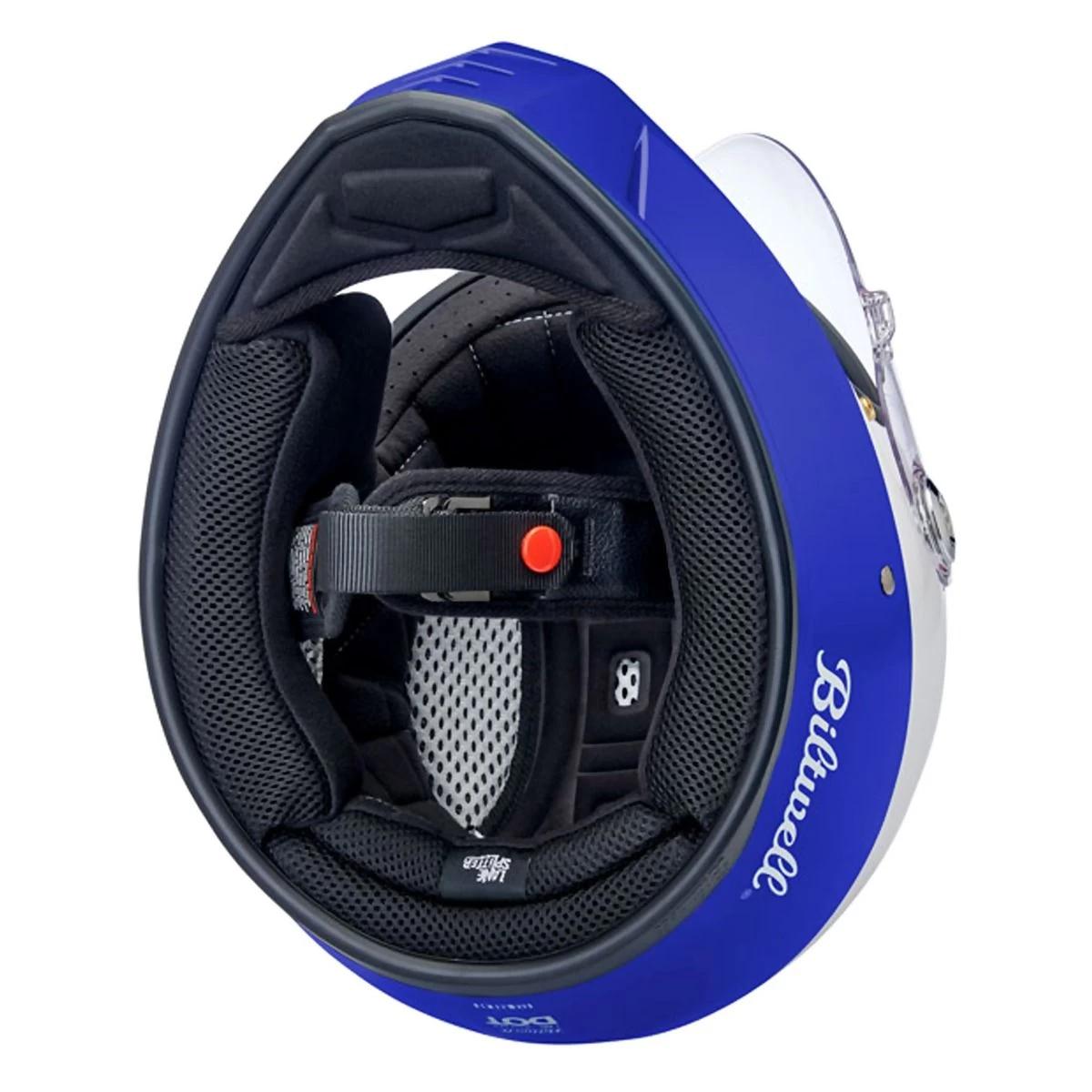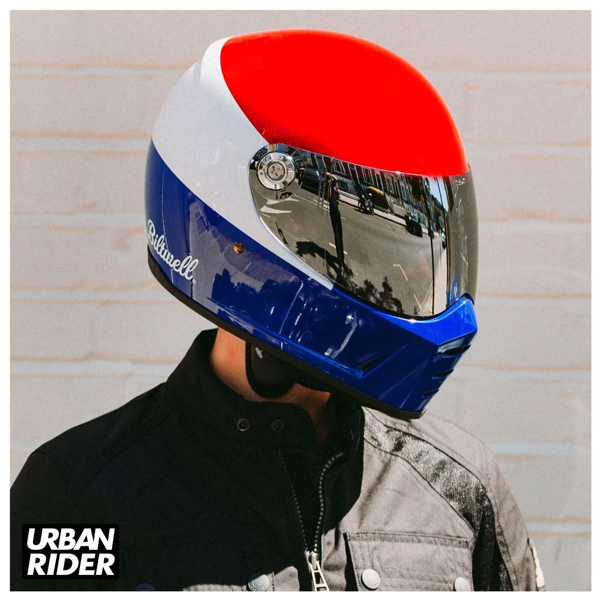 After the best-selling Gringo and Gringo S helmets, Biltwell brings us the Lane Splitter. This highly anticipated drag racing style helmet is crafted around Biltwell’s proprietary ABS shell and features a shock-absorbing EPS liner with gorgeous hand-stitched interior padding. Just like the Gringo and Gringo S, the interior liner with its removable cheek pads and BioFoam chin bar cushion makes for an extremely comfortable helmet that you can wear all day without experiencing any fatigue or discomfort. The aggressive looking lines of this helmet truly set it apart in the retro-styled helmet market. The front chin bar vents are a prominent feature and in combination with a venturi vent on the rear provide ample air-flow. The injection-molded face shield operates on simple hinge mechanics and the brass peg and hole lock mechanism is utterly utilitarian yet aesthetically pleasing in its simplicity. Opening and closing the visor becomes a breeze. Not literally though: the visor secures firmly in place to prevent any wind or rain leaking inside. A bold and brutish looking helmet at a very attractive price point, we’re big fans!