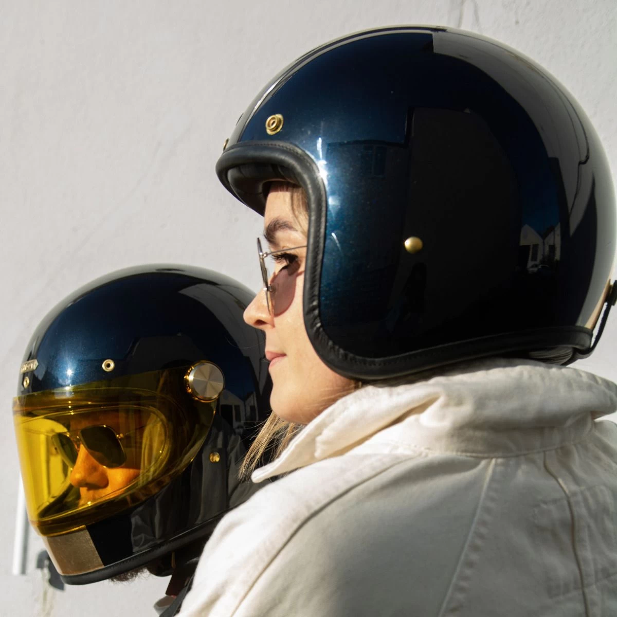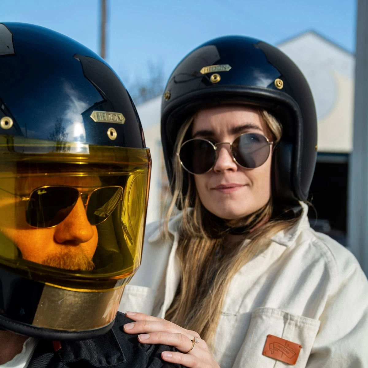 Two years later and the Heroine Racer is unveiled. As soon as our friends at Hedon walked in our London shop with the very first production samples, it became clear that this helmet would make quite the splash. This is the most beautiful full face lid on the market. Perfection in design, as we’ve come to expect from Hedon. The finish is absolutely stunning: the leather trim and metal hardware works a treat in combination with the Heroine’s sleek shell and colour schemes. The visor pivots around those gorgeous metal side pods and shuts with a satisfying click. Above the viewport, you’ll find three simple but effective vents. The liner doesn’t just look luxurious, its soft finish and ergonomic make this ECE certified helmet a joy to wear.
