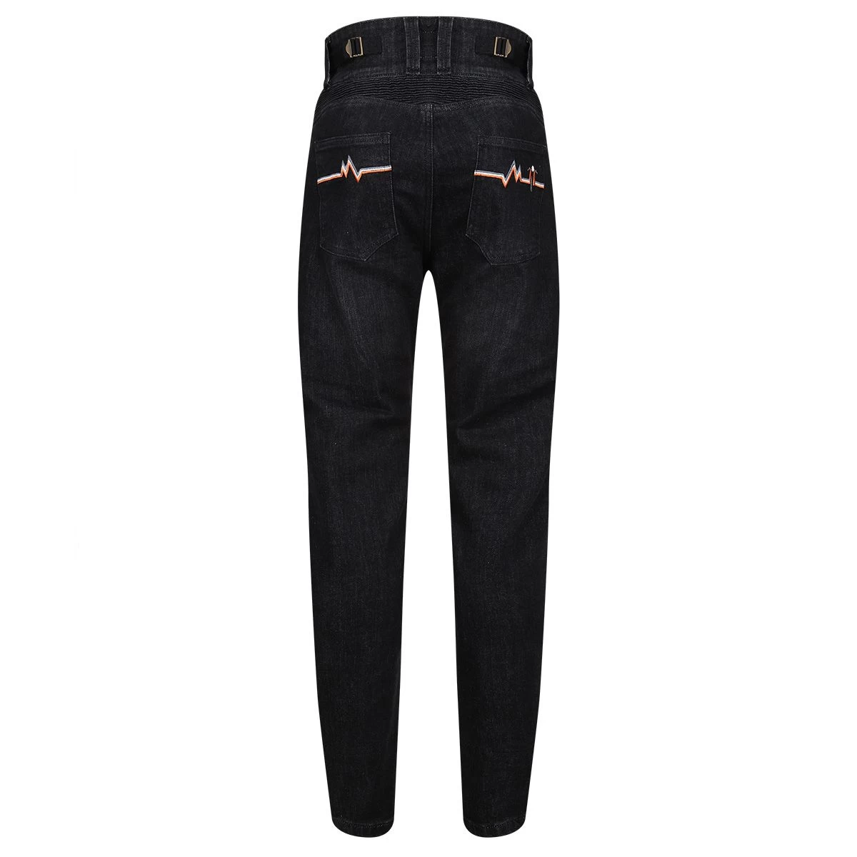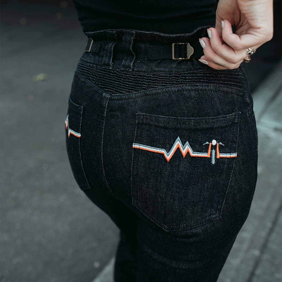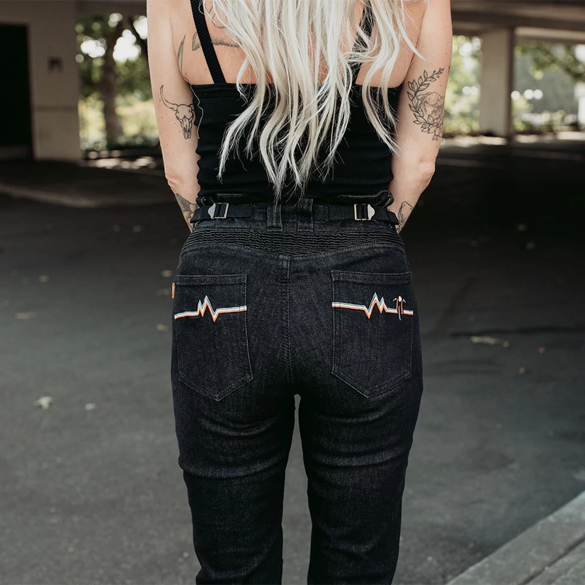 Introducing the Motogirl Ellie Jeans, a stylish and protective addition to the Motogirl product line. These jeans are designed with a single layer of stretched denim and feature a high waist with belt loops, front pockets with a decent size coin pocket, and back pockets with embroidery design detailing.