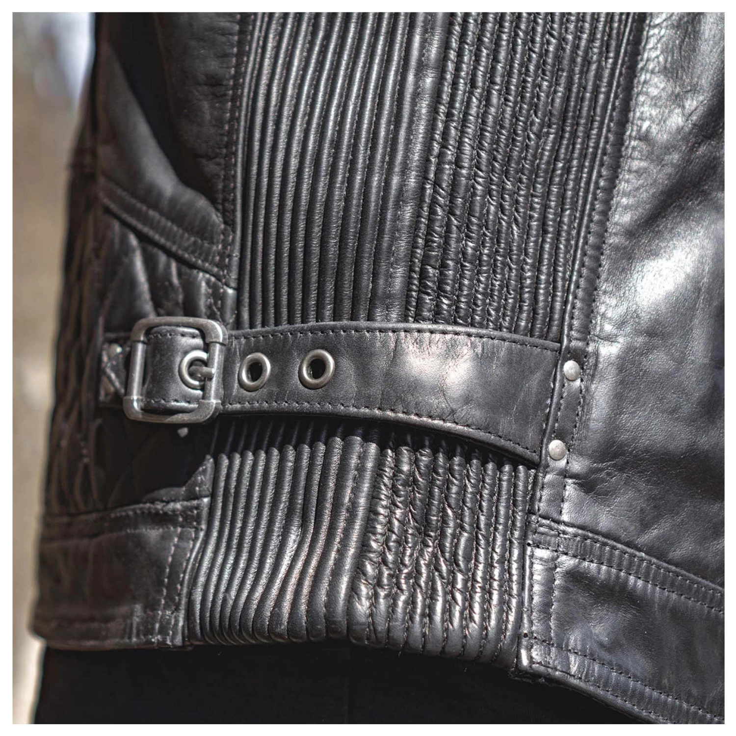 Each jacket is constructed from top grain hand-finished, washed and oiled premium Cowhide leather, meaning each one is as durable and unique as the last. We love the aggressive fit too. The rotated, pre-curved sleeves and the dropped back hem combine to for a natural feel when hunkered down on the bike.