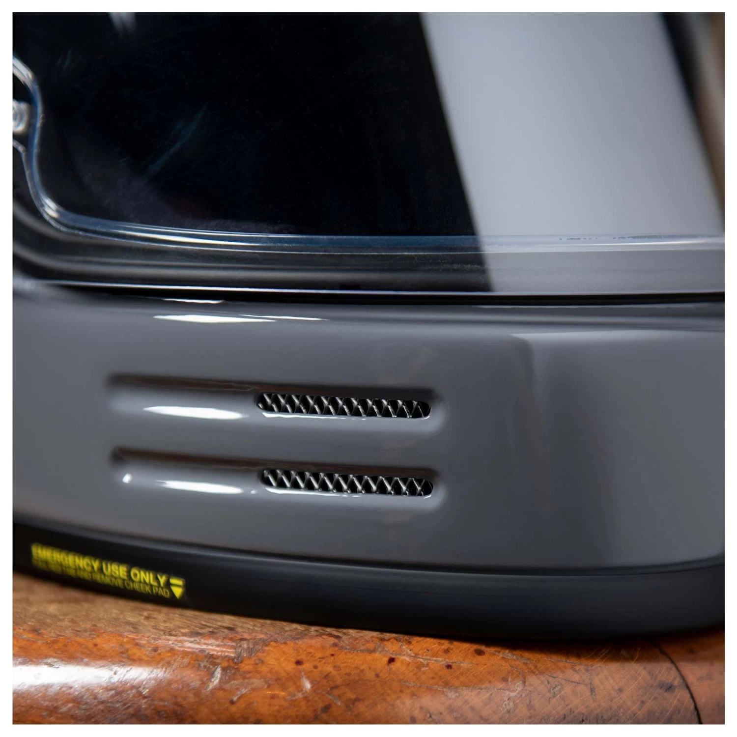 The EPS liner mentioned above has channels in them that allow airflow throughout the helmet when you open the forehead vent. Additional, mesh-backed vents can be found on the chin bar. Brushed metal side pods keep the visor in place and a rubber seal prevents any water or wind getting in. The visor can be equipped with the included pin-lock insert to stop it from fogging up.