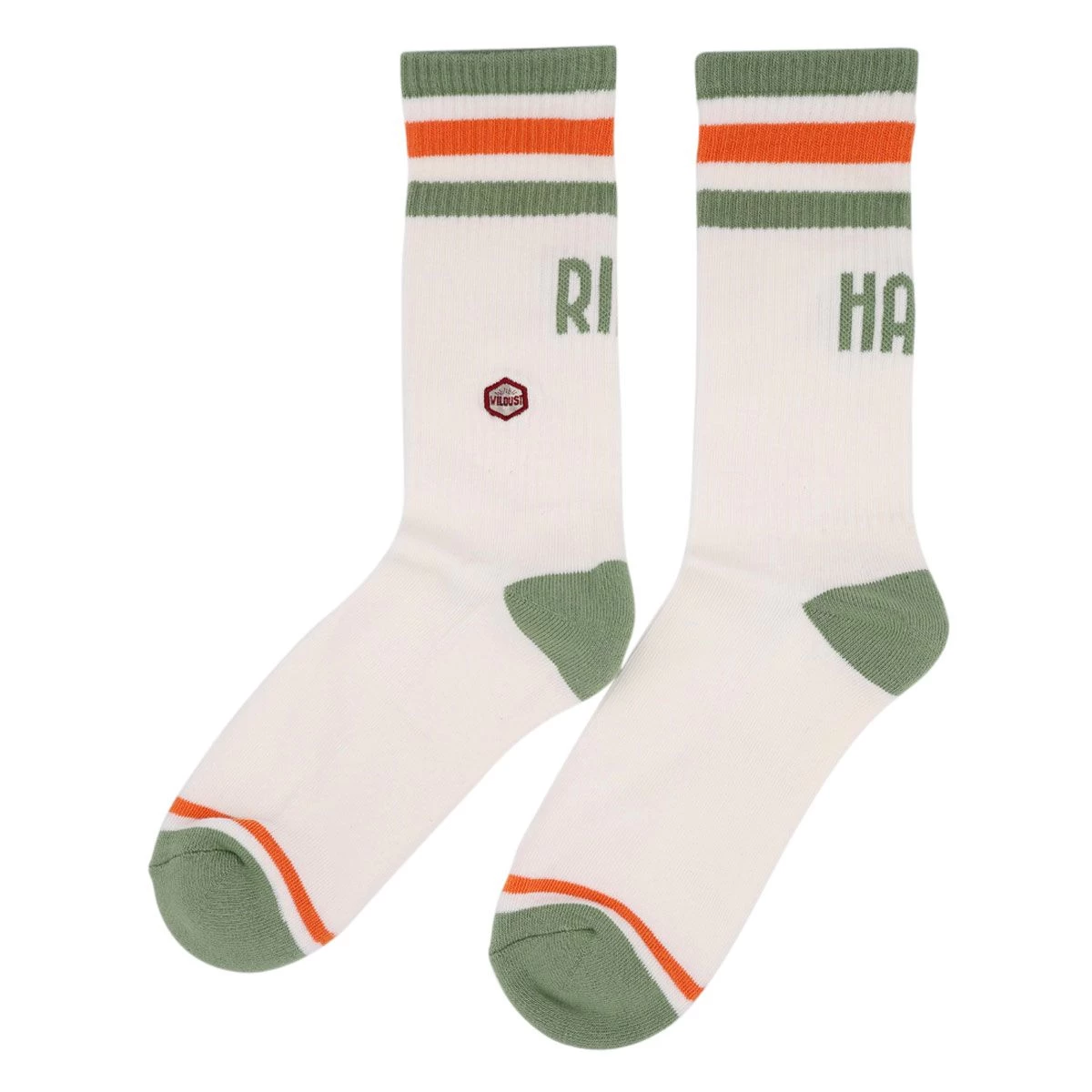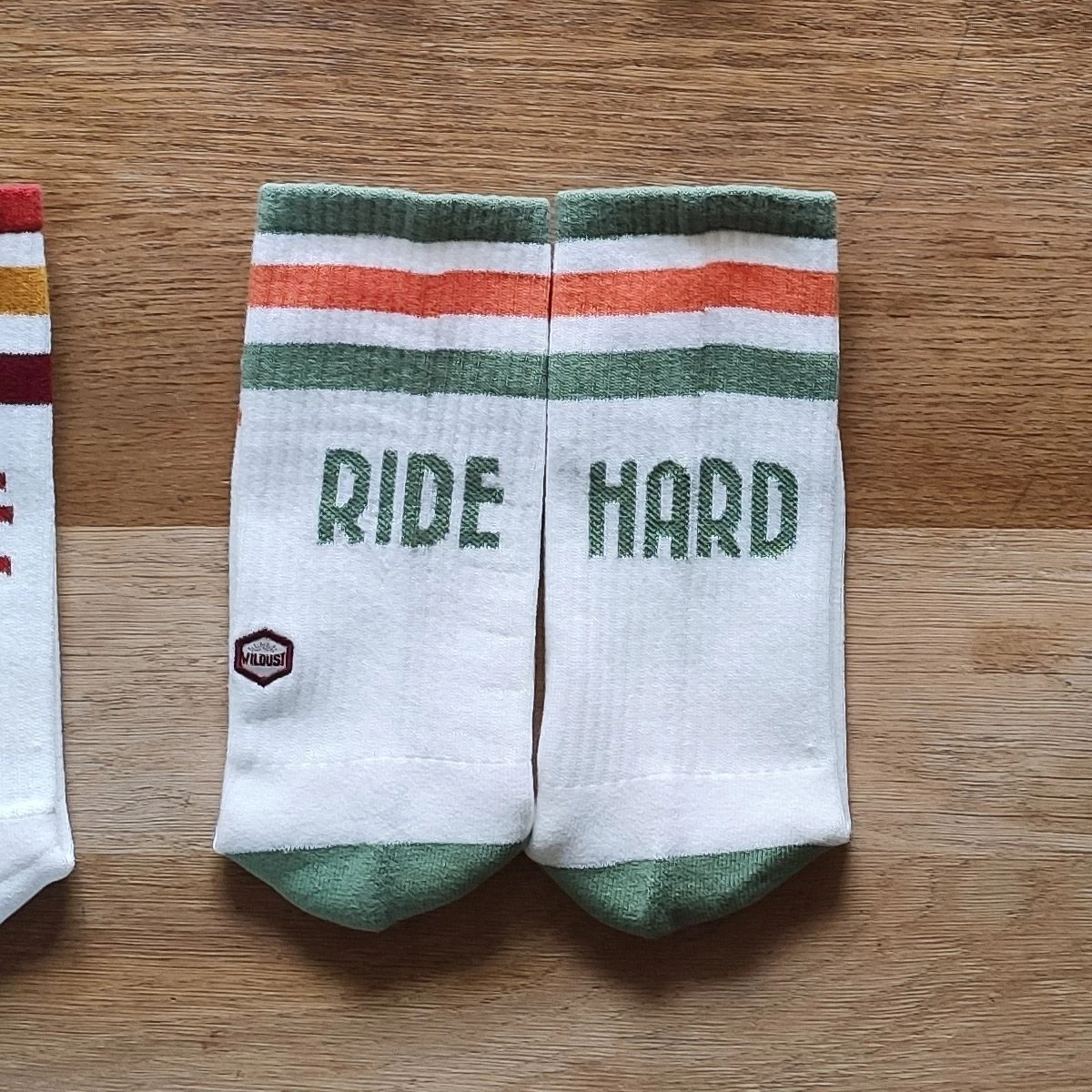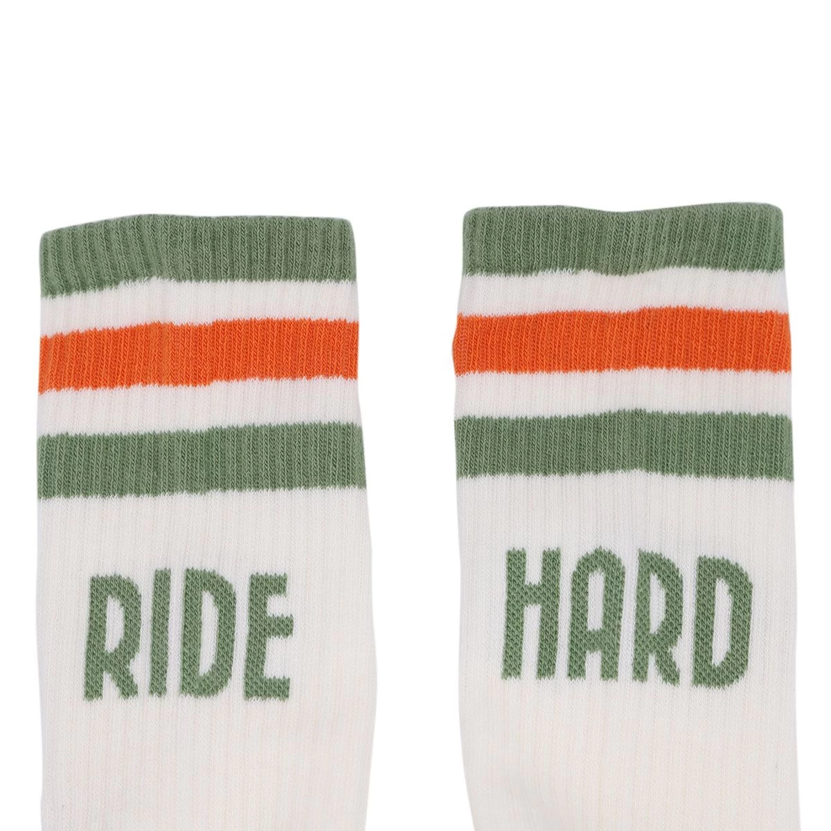 Original Wildust Sisters vintage ‘Ride Hard’ slogan socks. White 100% cotton construction with 80s inspired green and orange retro hoops.